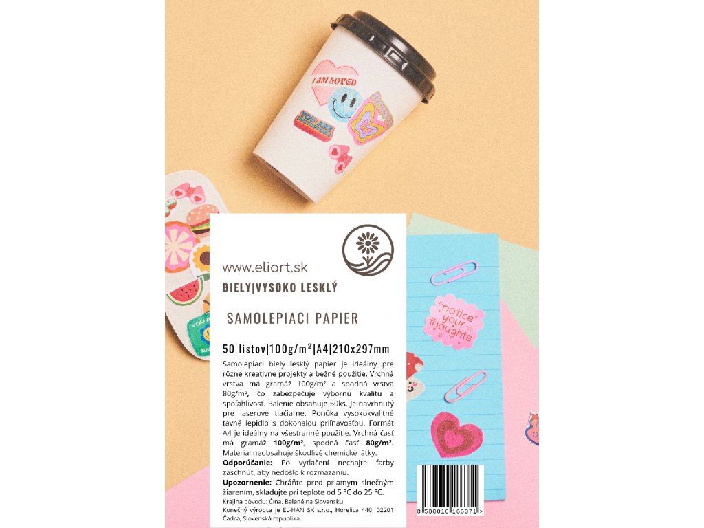 Vysoko lesklý samolepiaci papier formátu A4 (210×297 mm) je ideálnou voľbou pre všetkých kreatívcov, handmade výrobcov, tvorcov nálepiek aj malých podnikateľov. Tento papier ti umožní jednoducho a kvalitne vytlačiť vlastné samolepky priamo doma. Vďaka brilantnému lesklému povrchu dosiahneš profesionálny vzhľad a živé farby, ktoré vyniknú na každom projekte.