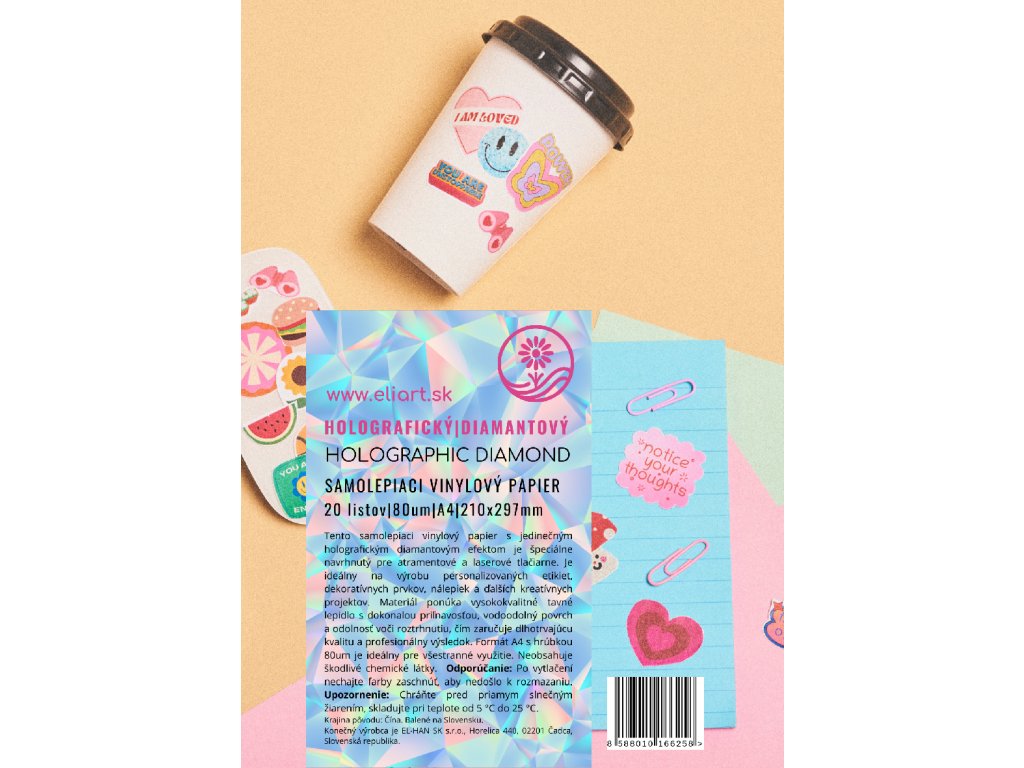 Unikátny holografický diamantový vinylový samolepiaci papier - fólia , ktorý je odolný voči vode a roztrhnutiu. Vhodný pre laserové aj atramentové tlačiarne.