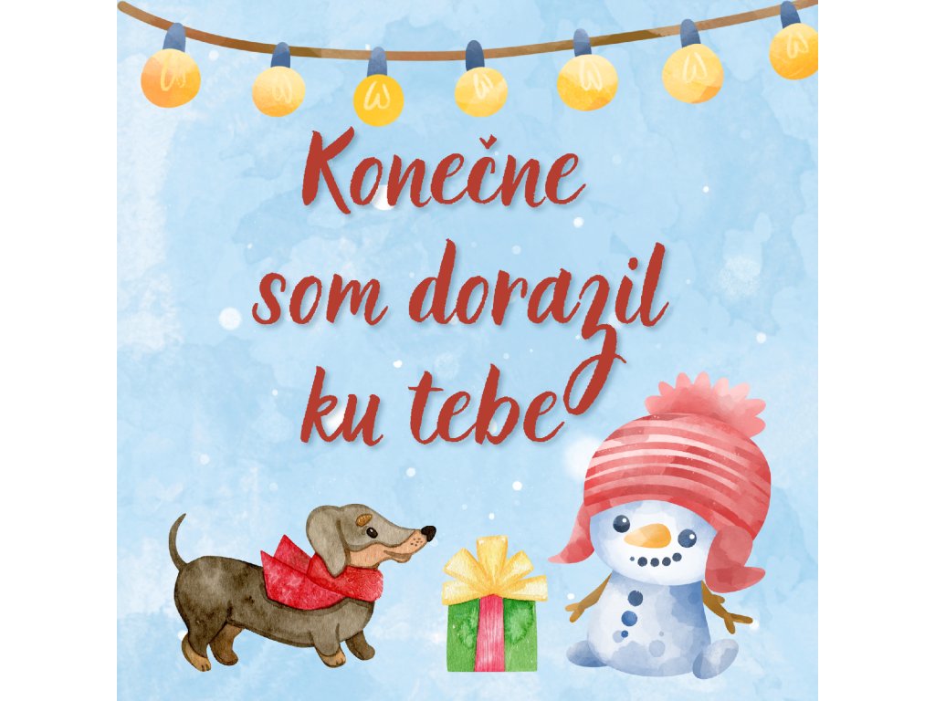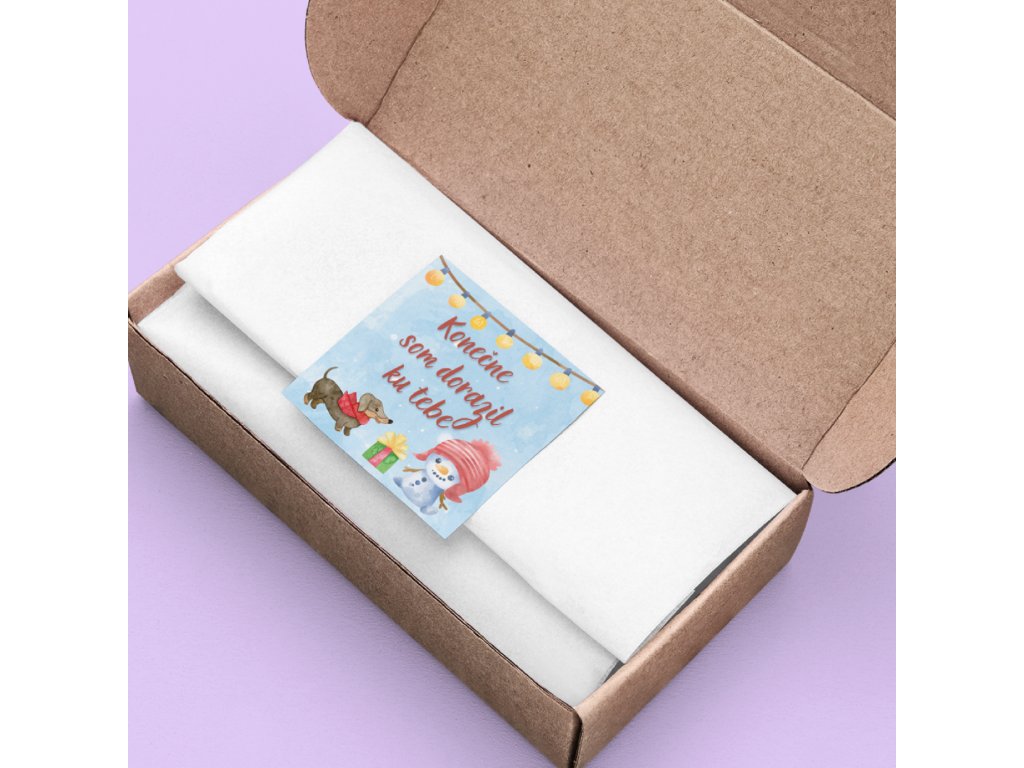 Na nálepke sa objavuje roztomilý snehuliak v červenej čiapke, psík s mašľou a darček pod svetielkami, všetko v jemných akvarelových tónoch modrej, červenej a hnedej.